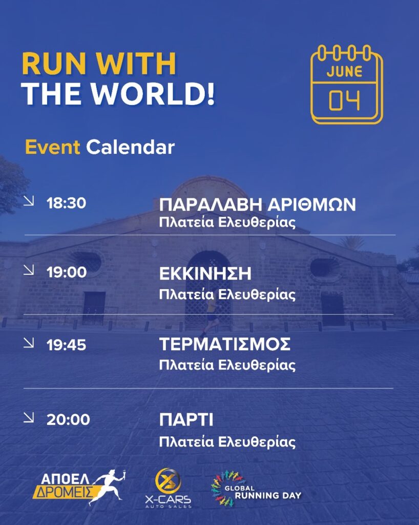Η πρώτη Τετάρτη του Ιούνη, έχει αφιερωθεί ως η “Παγκόσμια Ημέρα Τρεξίματος”. Το Τμήμα Δρομέων ΑΠΟΕΛ, όπως έχει καθιερώσει τα τελευταία χρόνια, γιορτάζει τη μέρα με ομαδικό τρέξιμο στη Λευκωσία, παρουσία ολόκληρου του δρομικού κινήματος της χώρας.